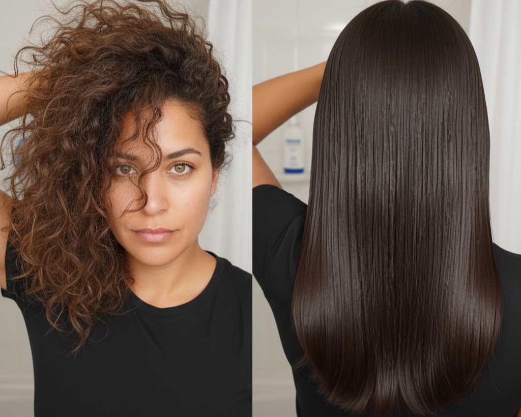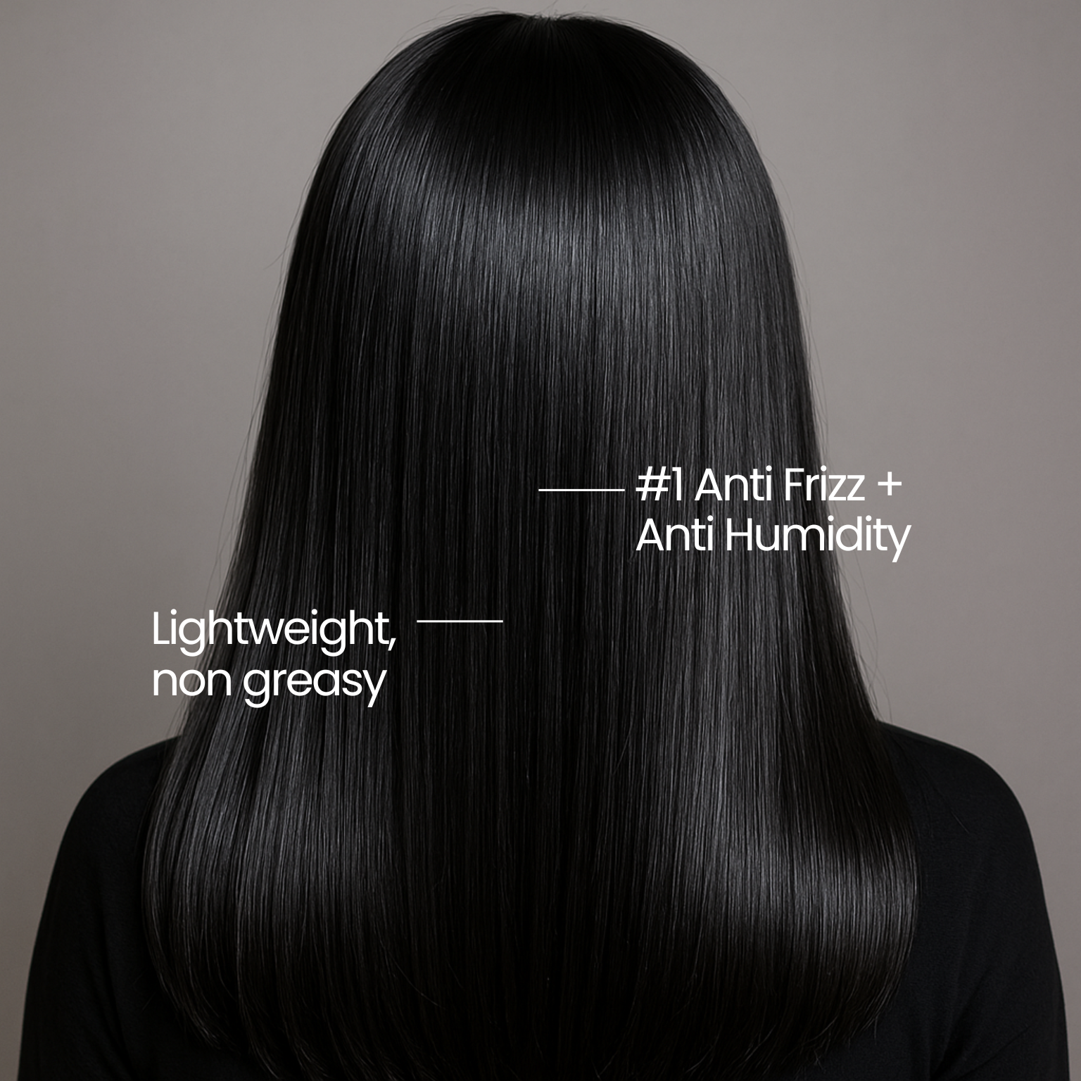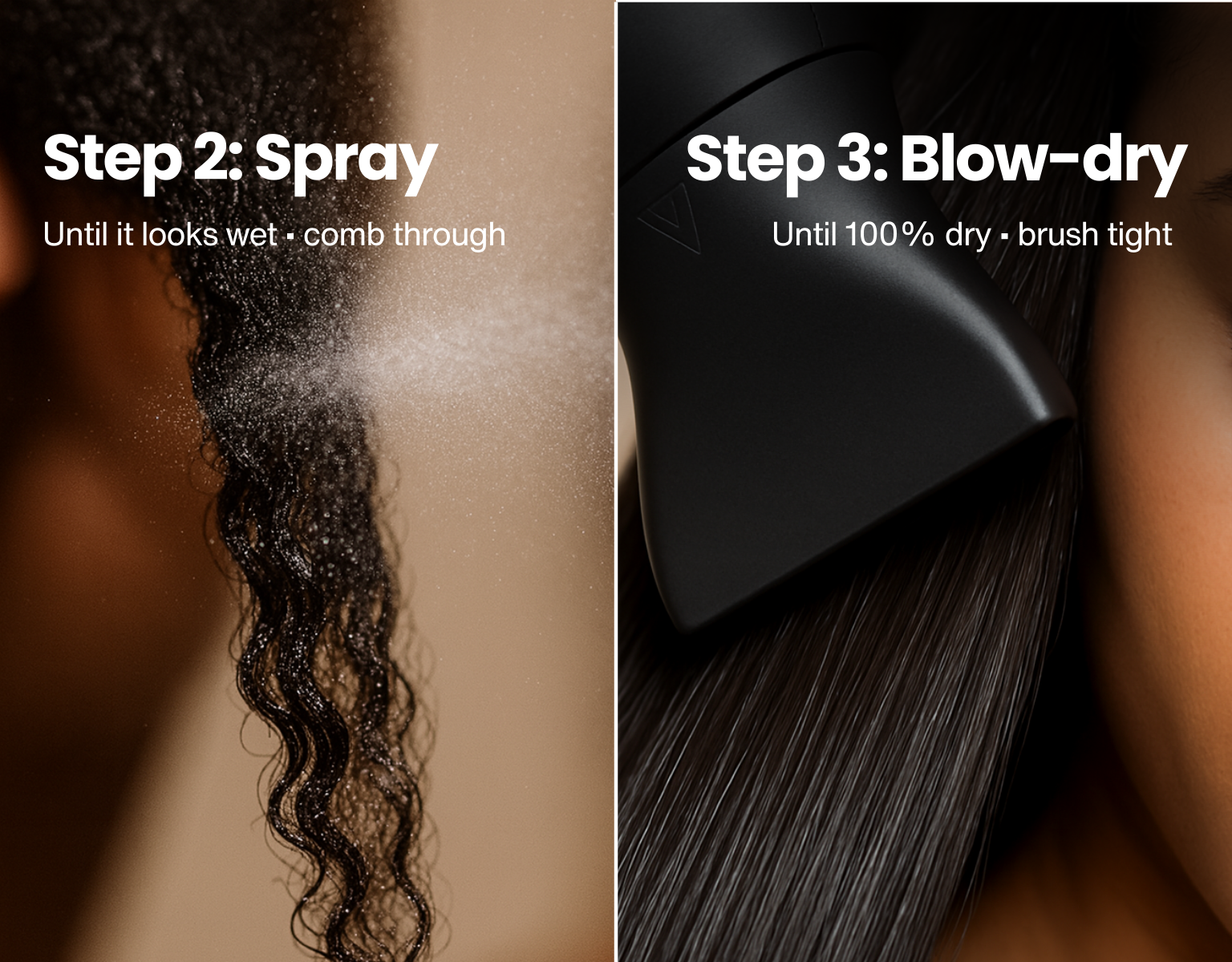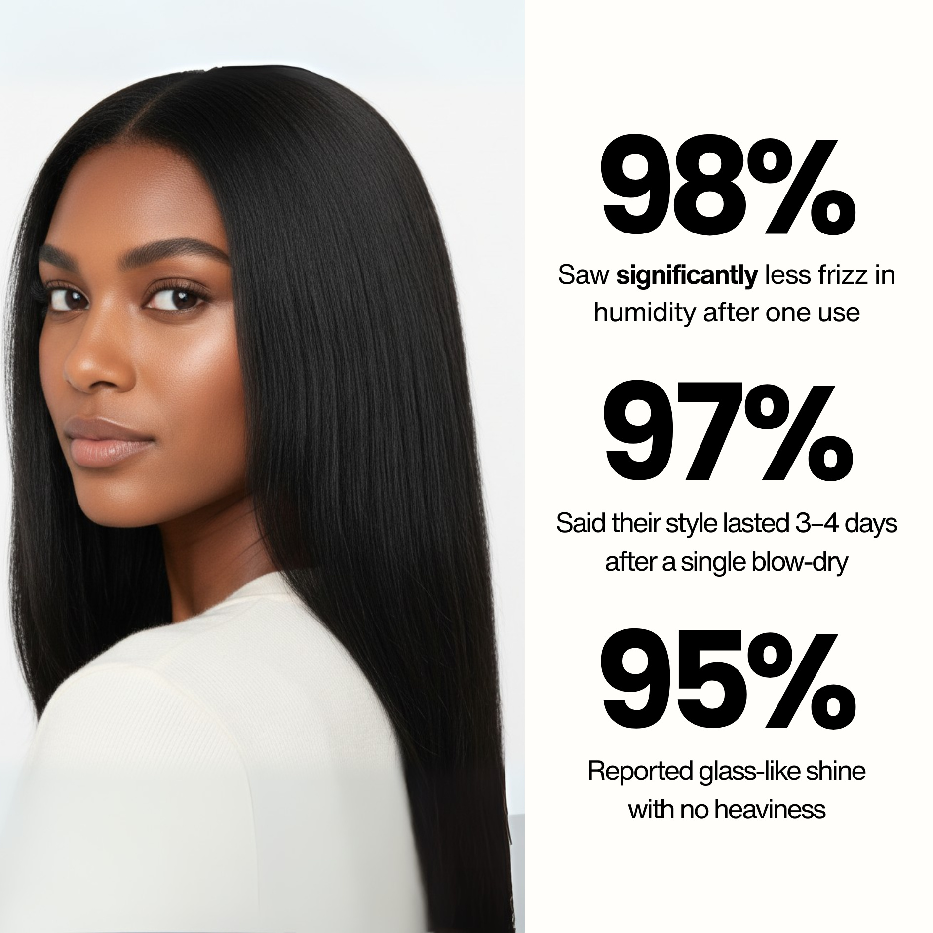 Spray every section & comb once. Blow-dry with brush tension to get 100%, humidity-proof, frizz-free shine for 3–4 shampoos.